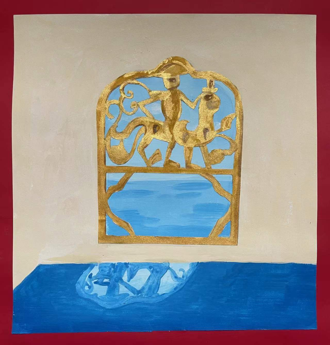 赵添乐同学的《金色的窗户》作品视觉冲击力很强,在一堆作品中马上能跳出来,他的金色技法有浮雕般效果,金色明暗画法会增加厚重感,神人骑虎造型再一次塑造中是直接与古代经典遗迹对话的,这种学习非常有必要。天蓝与宝蓝在一扇窗的变化中将观者带入两个空间,拉大了画面的延伸,氛围营造顿显丰富,金色与蓝色以及红边的搭配巧妙的化解了色彩的单调。想象力+表现力,是赢得最佳作品,缺一不可的两个重要元素。