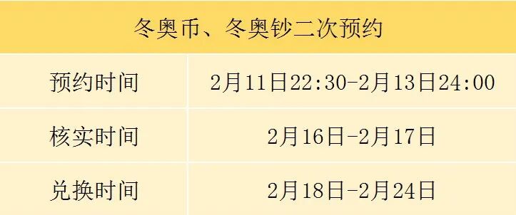 根据中国人民银行,冬奥会纪念币、纪念钞将于2月11日22:30分开始二次预约,每人可预约兑换限额各20套。具体时间安排如下: