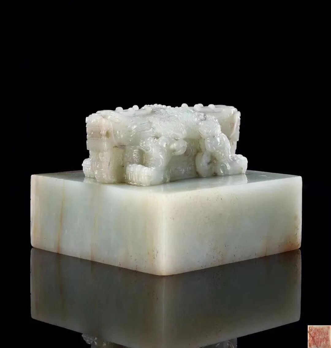 此件宝玺系法国藏家旧藏。用上等青白玉制成,体量巨大,气势撼人。清早期因西北动乱,玉路不畅,宫廷用玉仍需仰仗前朝遗留。乾隆二十四年平定西域,定春秋玉贡之制,内府玉材始大为充沛,优质的青白玉更是成为玉料大宗,广泛用于制作玺印、陈设、礼器、日用器皿等。且乾隆皇帝爱玉成癖,广招能工巧匠,尤其是苏州玉匠入京,对玉作关心备至,每制一器,往往亲自过问其选料、画样乃至打磨、配件等事,当时官造玉器,皆选料精当,制作细致,非后代能及。![]()