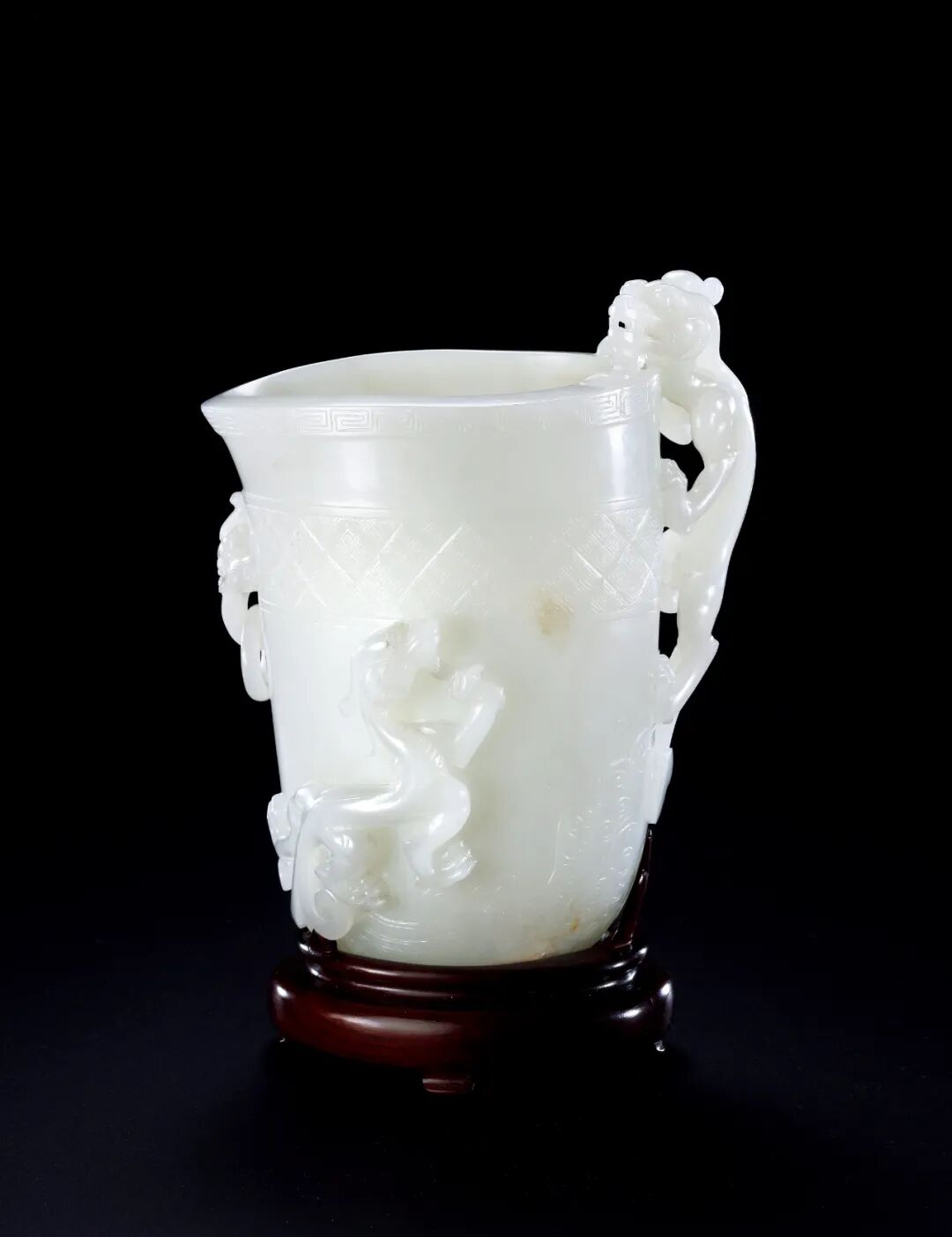 本件青玉填金王献之《中秋帖》暨《洛神赋十三行》插屏,插屏两面均刻有文字,字内填金。一面为著名的三希堂法帖晋王献之书《中秋帖》的原文,并将原书法上的印章也一并照搬刻琢。左有唐代著名书法家、书学理论家张怀瓘书写:“神韵独超,天姿独秀”及“乾隆宸翰”阴刻篆书方玺。再左有乾隆帝写于法书《中秋帖》上的行草跋文:“大内藏大令墨迹,多属唐人钩填,惟是卷真迹,二十二字,神采如新,洵希世宝也。向贮御书房,今贮三希堂中。乾隆丙寅(1746年)二月御识。”下有“乾”“隆”圆方二玺。反面阴刻填金字,为王献之书《洛神赋》遗留下来的部分石刻拓本《十三行》。其两面通体饰以金彩。玉版集王献之行草书、楷书最享负盛名之两件作品于一身,并钤“三希堂”印章,身世不凡,当为乾隆帝三希堂所藏。北京保利 2021「深圳」精品拍卖会 凝沚—诸家雅蓄中国古董珍玩估价:15,000,000 - 20,000,000 人民币清乾隆御制白玉龙纹觥雕工精致,选材上乘,是难得一见的宫廷观赏玉器。这件白玉觥身份尊贵,流传有序。曾为香港船王赵从衍旧藏,在 1987 年的香港苏富比上拍。北京华艺国际 2021 秋季拍卖会 大美——古代宫廷器物夜场估价:12,000,000 - 18,000,000 人民币