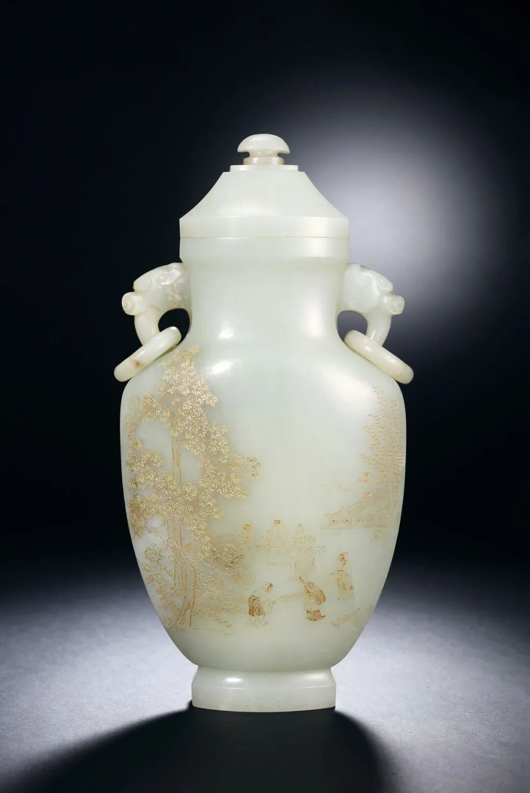 本品为乾隆帝祝寿之物,盘点全球公私藏品,也难以找到与之相同者。如此大料的优质黄玉为材,精雕细琢,在乾隆宫廷如意中极为罕见。北京保利 2021 秋季拍卖会 禹贡 Ⅱ—郎世宁绘《纯惠皇贵妃油画像》暨重要宫廷艺术估价:8,000,000 - 12,000,000 人民币本品以黄玉雕成,玉质极佳,玉色纯净,莹润如脂。雕作环形独角夔龙,双面浮雕,纹饰相同。夔龙蚕眉珠目,高额长吻,獠牙外露,吻部接尾,独角弯曲向前,龙鳞抽象成一排月牙形凸起,龙身内侧装饰涡纹,背部出戟,龙尾向外卷曲分叉。此龙造型仿古,与新石器时代我国北方著名的红山文化出土的玉猪龙类似,遍体装饰纹样仿自商周玉龙。清代宫廷的仿古玉器虽多,但其中黄玉质地者并不多见,此佩所用玉料极佳,造型优美大气,雕工精绝,刀刀精到,实为宫廷仿古玉中的珍品。北京保利 2021 秋季拍卖会 禹贡 Ⅱ—郎世宁绘《纯惠皇贵妃油画像》暨重要宫廷艺术估价:9,000,000 - 12,000,000 人民币此“桐阴博古图盖瓶”,选用整块上乘和田青白玉料琢磨而成,器型典雅端庄,上有盖,盖有圆钮,扣合紧密而旋转自如。瓶身直口、短颈、斜肩,瓶腹微下敛,底有圈足。左右有对称的衔环耳,耳上刻云纹。瓶身正面取宫廷收藏的崔子忠《桐阴博古图》画意,镌刻文人士大夫在梧桐树下鉴赏古玩的场景,背面刻乾隆御制诗《崔子忠桐阴博古图》,刻工极精美,人物意态生动,树石布景亦皆得法神妙,字迹结体端正,气韵贯通。图文皆涂金,与细腻润泽的玉质交相辉映,更添光彩。此瓶虽小,但从中确可管窥乾隆的帝王心术及当时的天下大势。华艺国际(北京)2021 春季拍卖会 大美——古代宫廷器物专场长 13.5cm;册页长 15.6cm;宽 9.5cm