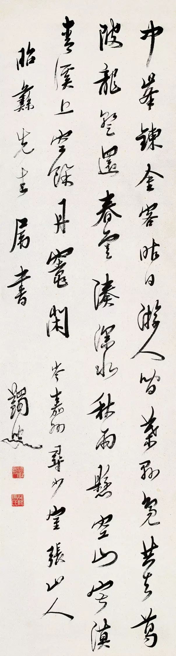 注:石涛,俗姓朱,名若极。出家法名元济、原济,号石涛、苦瓜和尚、大涤子、清湘老人等,擅书法绘画诗文。提出了“收尽奇峰打草稿”“法自我立”“一画论”等著名的绘画理论,书法崇尚自然,不拘古法,自成一家面目,其书其画非功力深厚者不可妄学,否则会入狂怪。传世绘画书法作品较多,为世人所宝。