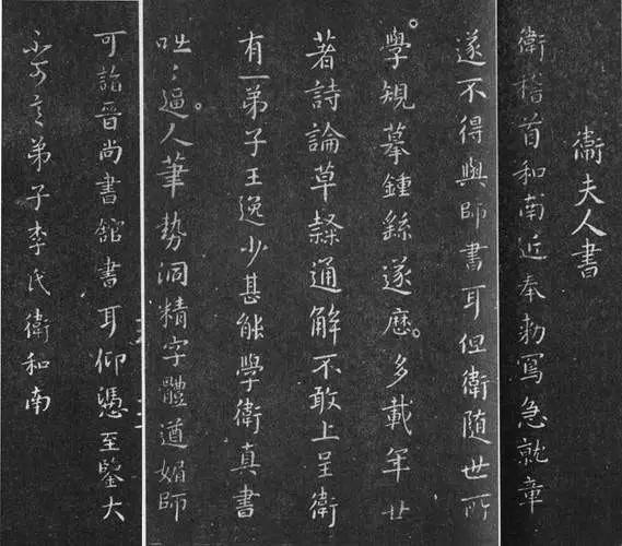 注:卫铄,字茂漪。东晋女书法家,善隶书。师承锺繇,深得其法,羲之少时师之。有书论《笔阵图》传世,或云王羲之撰,或云六朝人伪托。