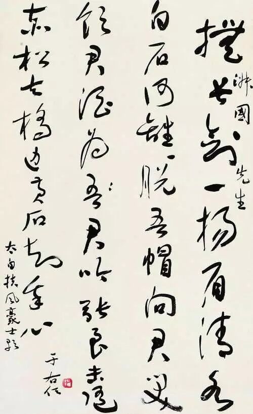注:于右任,原名伯循,字骚心,号髯翁、太平老人。精诗文工书法,草书最得法,颇有怀素、八大山人笔意,结体结字缠绵婉转而少连带牵丝,潇洒散朗清润,闲逸庄重。拟将草书标准化,作有《标准草书千字文》等,惜其愿未得广传。