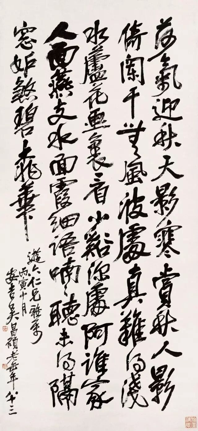 注:白蕉,原姓何,字远香,号旭如,另署济庐、复生、复翁。精诗文书画,行草书才情横溢。一生只喜二王而多变化,在王书的基础上参以现代书法技巧,吸古化为我用,避免了食古不化之嫌,形成了隽洒秀美、意远韵高的书法风格。其于书法浸淫穷构全力,尝自言为“仇纸恩墨废寝忘食人”,由此可人一斑。余最喜其《题兰杂稿卷》,此卷纵逸无极,天真烂漫,笔到处出神入化,用墨浓淡相间,如星似点,随手而来绝无造作之态,尽得王书精神,可称近现代书法极构。沙孟海《白蕉题兰杂稿卷跋》云:“白蕉先生题兰杂稿长卷,行草相间,寝馈山阴,深见功夫。造次颠沛,驰不失范。三百年来能为此者寥寥数人。”呜呼!“笔飞颠沛冲霄汉,素月清空夜点星”,这是我读白蕉此卷发出的惊叹。除了书法作品外,白蕉先生还为世人留下了《云间谈艺录》、《客去录》、《济庐诗词》、《书法十讲》等珍贵的文字作品,所以对于白蕉先生,我们仅以书法大师称之,是不能全揽其艺术才华的。
