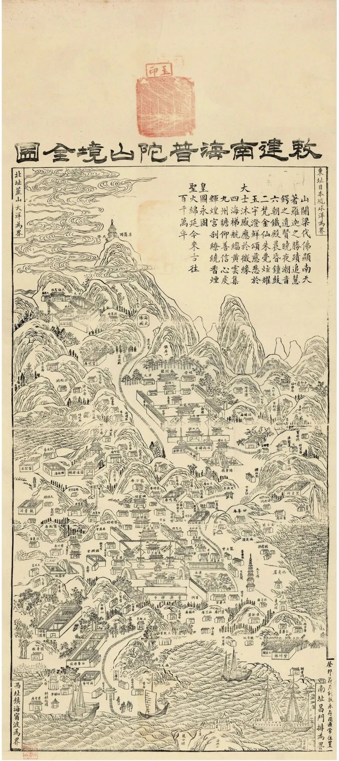 山西五台山、浙江普陀山、四川峨眉山、安徽九华山并称佛教四大名山,分别是文殊菩萨、观音菩萨、普贤菩萨、地藏菩萨的道场。这些佛教名山香火繁盛,信众不绝,催生了许多兼具实用性与宗教性的佛教名山舆图,其中主要有《五台山名胜图》《四川大峨眉山全图》《敕建南海普陀山境全图》《大九华天台胜境全图》等佛教名山舆图。