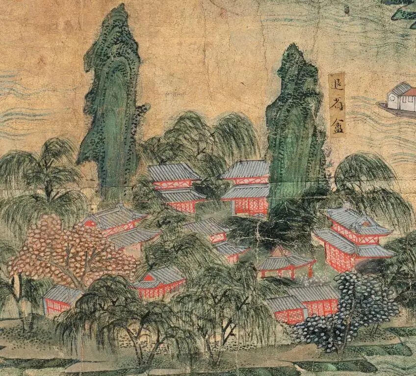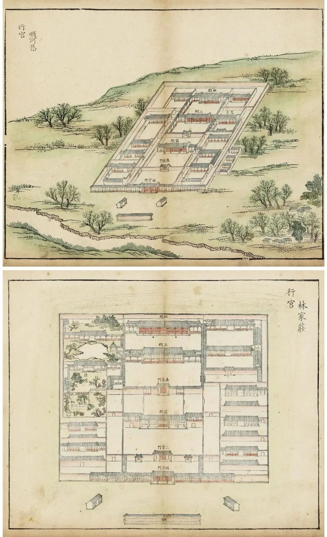 元代,陶宗仪的《辍耕录》将以宫室、楼台、亭阁等建筑为题材,以山水、林泉为背景而用界笔直尺画线的绘画称作“界画楼台”,列于画种第十,正式确立了“界画”的画种地位,使其内在涵义得到了丰富和提升。明清时期,“界画”常常用于表现皇家殿宇、宫苑、亭台楼阁、寺庙等题材,也恰恰适用于描绘清朝皇帝南巡沿途驻跸的行宫建筑。集成所选的这几种行宫图就是采用“界画”的技法,用平面和立面相结合的方式形象描绘皇帝驻跸的行宫建筑,细腻而准确地画出地图要表现的建筑物件以及周围的环境。