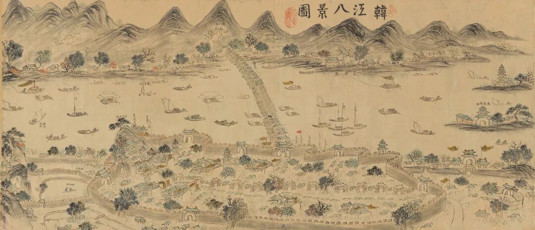 名胜卷。中国古代素有景观叙事之传统,人们或将某一风景名胜的历史源流、四时变迁、相关诗文加以融会,或将某地最具代表性的风光景致提炼为“八景”“十景”,用名胜古迹记录历史以留住乡情,涵育文化底蕴以深化审美意境,由此形成独特的地域文化和景观文化。各具特色的地域景观、文化胜迹衍生了大量舆图画作,它们往往将地理要素与艺术呈现相融合,兼具舆图的实用功能和艺术创作的审美特性,更有些诗画相配,体现出浓郁的人文气息。从名胜图卷选出的《江山胜迹图》《关中八景图》《广陵名胜全图》《桂林十二景模本》《韩江八景图》等,读者均能从画面与诗文之中体会到浓烈的地域文化氛围。