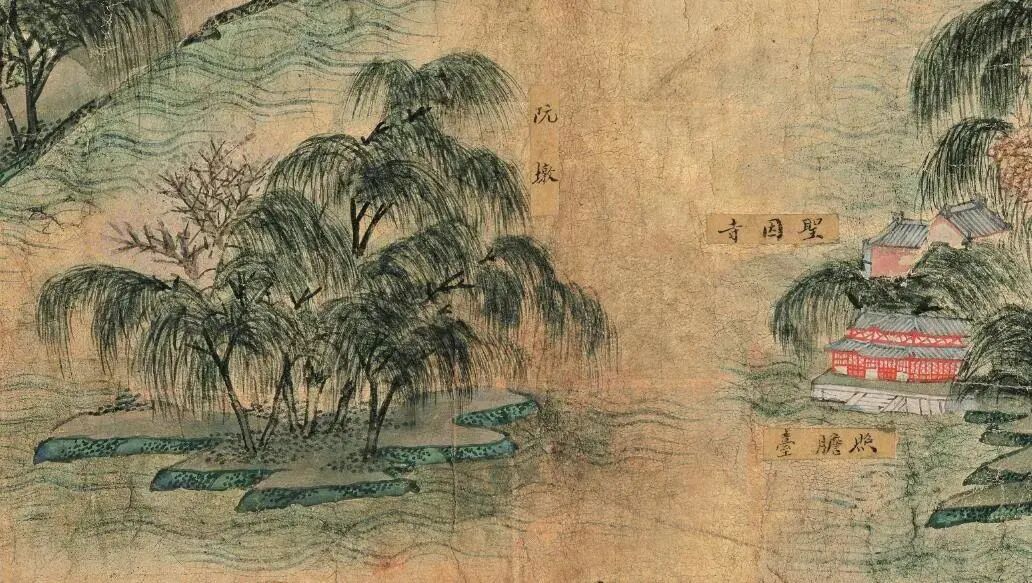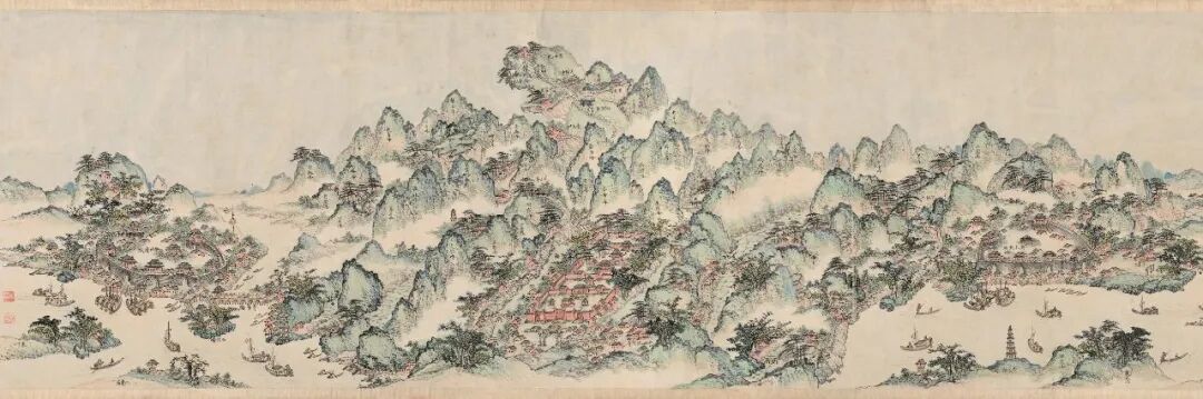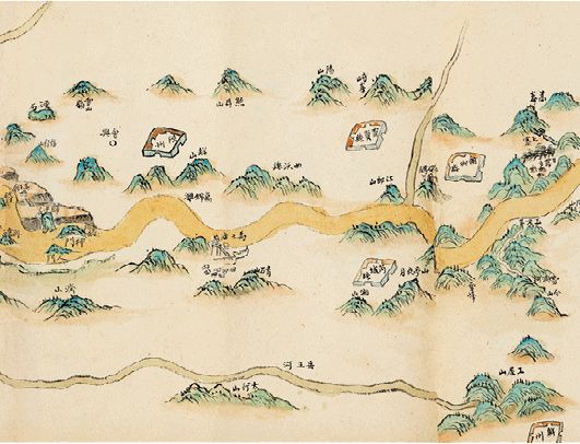 那么,怎样区别山水画和山川舆图呢?作为地图,应向读者提供地名、方位、位置、距离,即使眼睛难以看到远方或被山峦遮挡的城池、楼塔、亭阁,也一定要在图上标记出名称。因此,如果画面上有比较多的地名或建筑物名称的注记,则一般可将之视为山川舆图,而不再是山水画了。