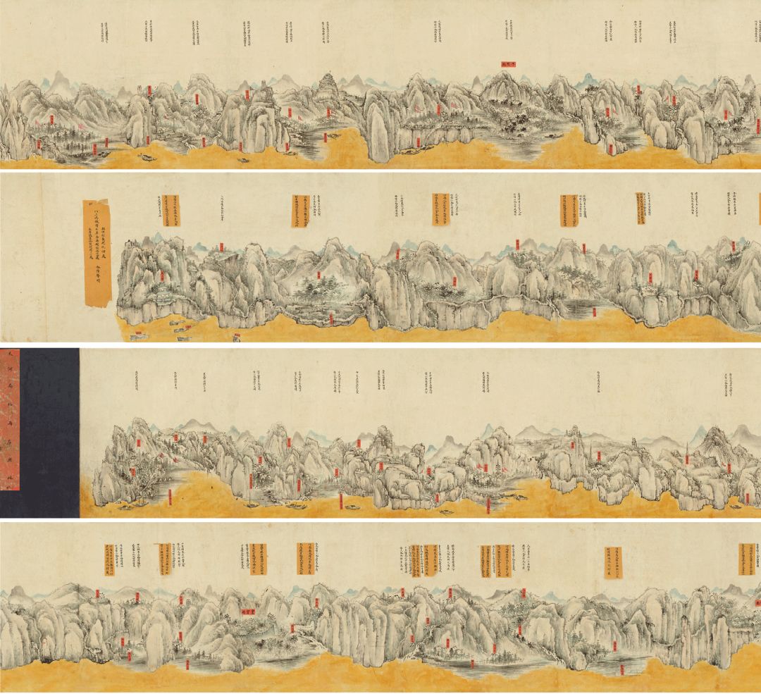 第二,系统性。不管是从纵向的时间脉络,还是横向的专题收藏来看,国家图书馆藏山川名胜舆图都具有较强的综合性和系统性,为同行业之翘楚。从内容上看,涵盖了大量重要的名山大川;从载体形态来看,包含长卷、竖轴及册页等多种形式;从文本形态来看,包含了绘本、刻本、拓本等等;从作者身份上看,包括了宫廷画师、文人艺匠和民间画工等;从地图绘制方法上,既有工笔界画,也有渲染写意画,分景图与全景画皆备。其中的内容涉及自然与人文景观、诗文颂赞、图绘艺术等多个方面的历史信息,能够较为全面地反映中国古代山川名胜舆图的发展脉络,可以说是一个内容丰富、种类繁多的文献宝库,值得我们进行深入的文献挖掘和专题研究。