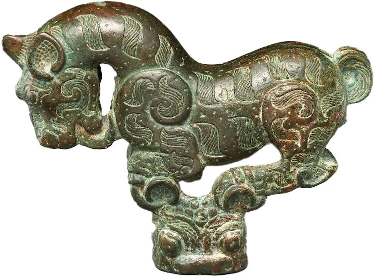 魏晋南北朝时期,民族大融合,政权走马灯般地更迭,社会的转变是全方位的,包括风俗和观念等等。虎形象的象征意味发生了演化和改变,其造型、形状、用途也发生相应的演变——从外表威武勇猛、内藏诡谲仙气,渐渐成为为仙人所降服的角色,甚至充当温顺坐骑。也许是出于当时的风尚,东晋著名画家顾恺之还为自己取了一个小名叫“虎头”,因精于绘事,才绝、画绝、痴绝,时人称为“虎头三绝”。