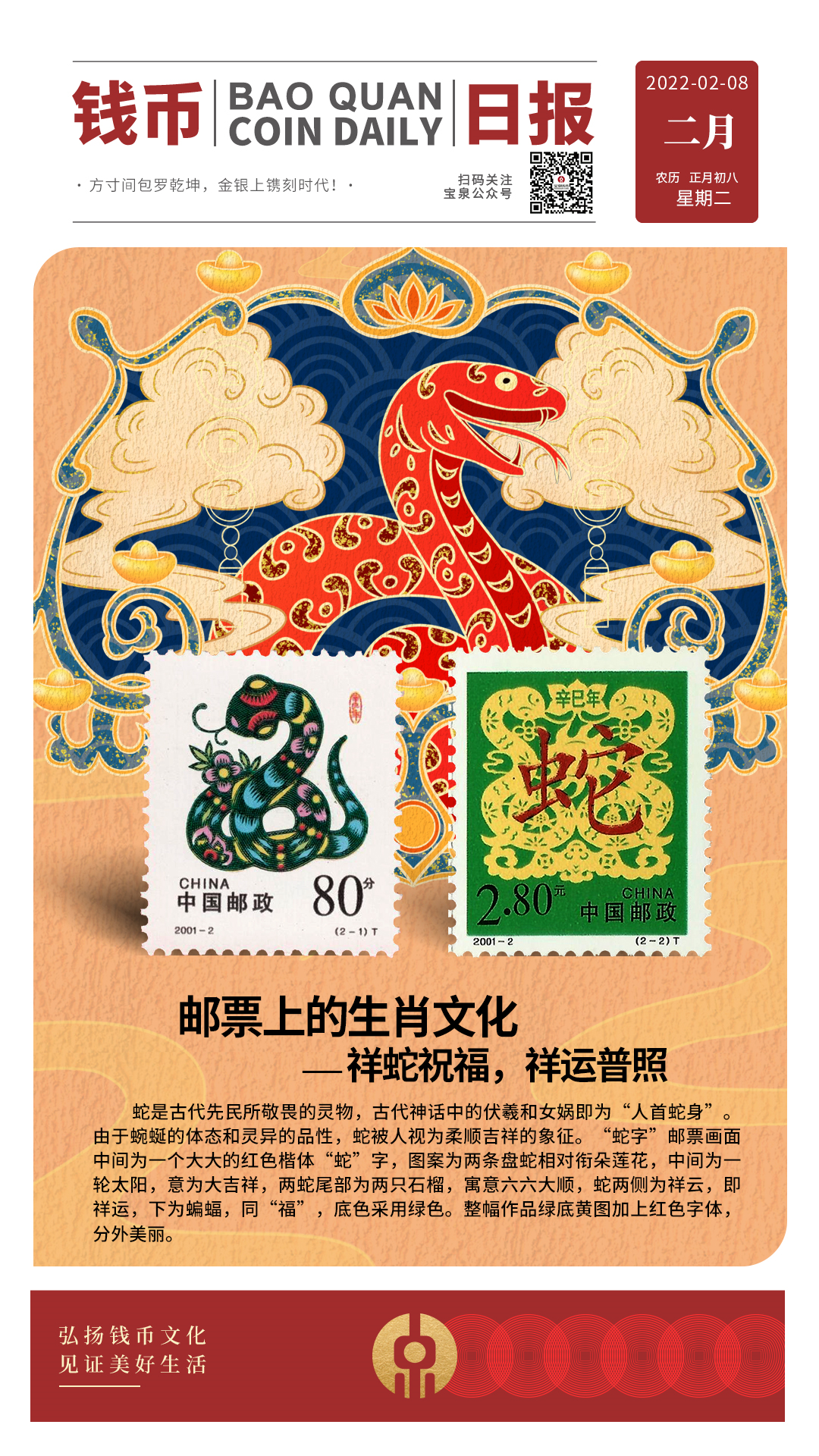 【钱币日报】邮票上的生肖文化——祥蛇祝福,祥运普照