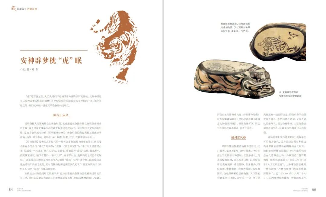 一见封面上的这只“小老虎”,是不是觉得又萌又逼真?这可是一件大有来头的文物,为现藏于上海博物馆的金代黄地黑彩雁衔芦苇纹虎枕。作为“百兽之王”,在中国传统文化中,虎被寄托着消灾辟邪的吉祥寓意,是正义、勇敢的象征。借助虎虎生威的活泼热闹,来看看本期有哪些尤其值得一读的重点吧。