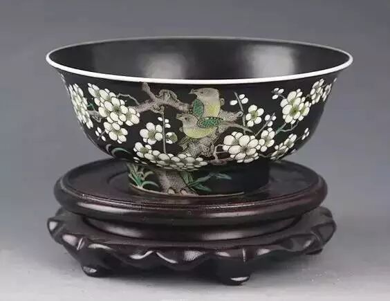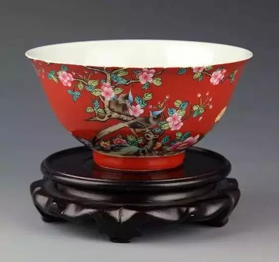 清雍正 珐琅彩赭墨梅竹图碗 蓝料双方框