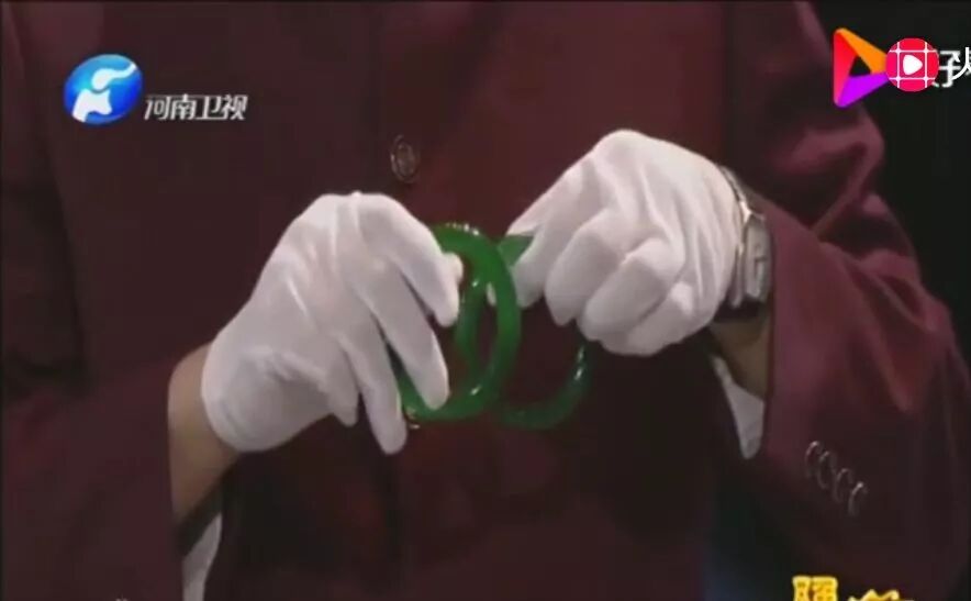 当然,盒子不对,不一定代表里面的翡翠手镯也不对。再来看看这对满绿手镯,敲击起来的声音暗哑沉闷,真正的A货翡翠声音清脆且悠扬。所以这对手镯也有造假的可能。