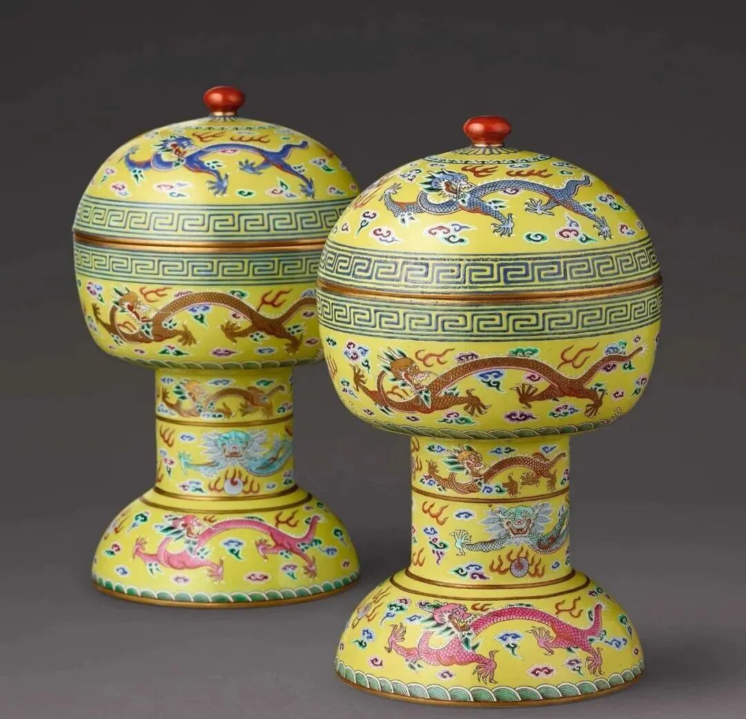 清道光 粉彩黄地九龙纹豆一对(200-300万)