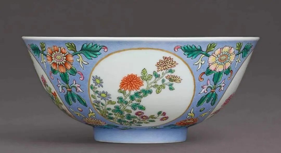 清道光 内青花外粉彩浅蓝地轧道开光菊花碗(30-40万)