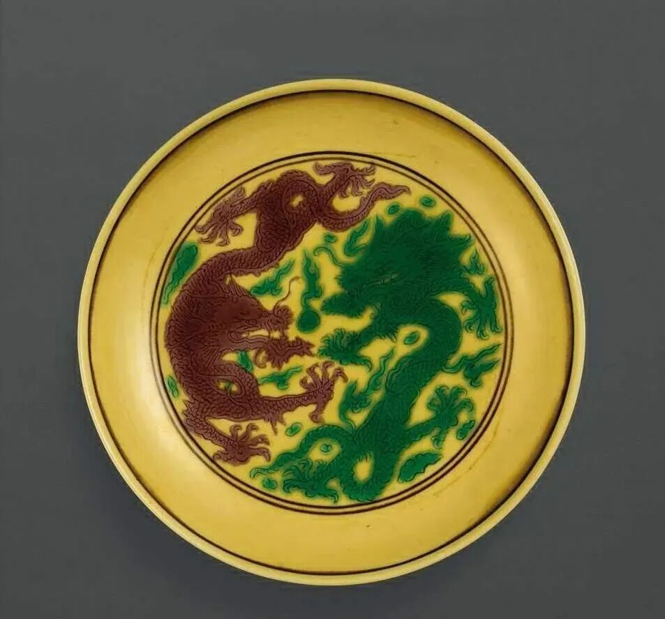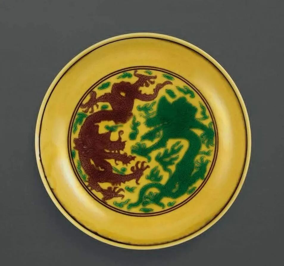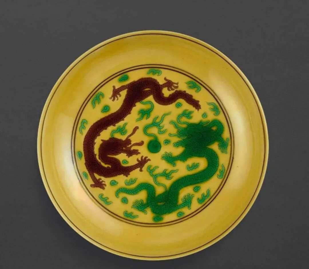 清乾隆 黄地紫绿彩双龙戏珠纹盘(20-30万)