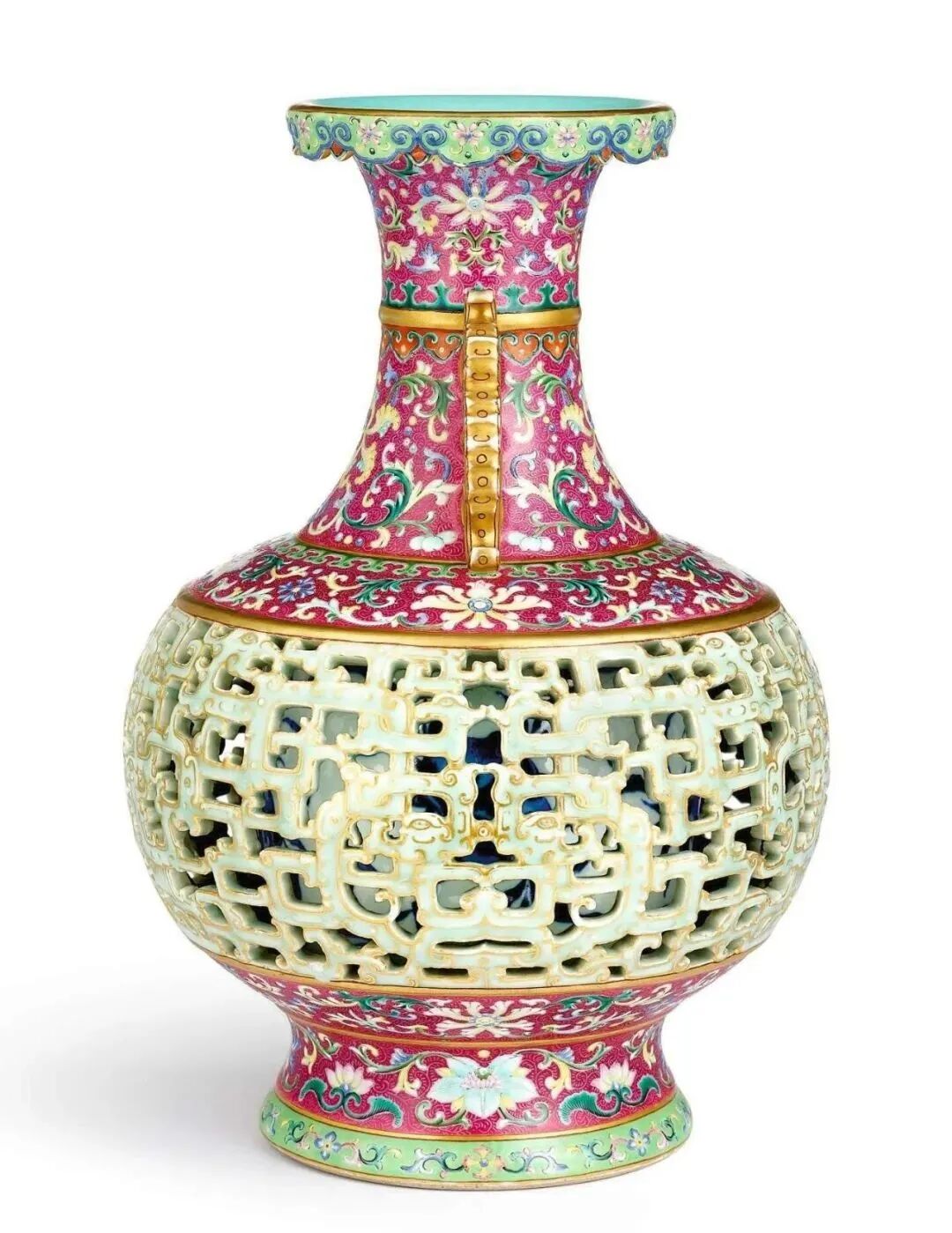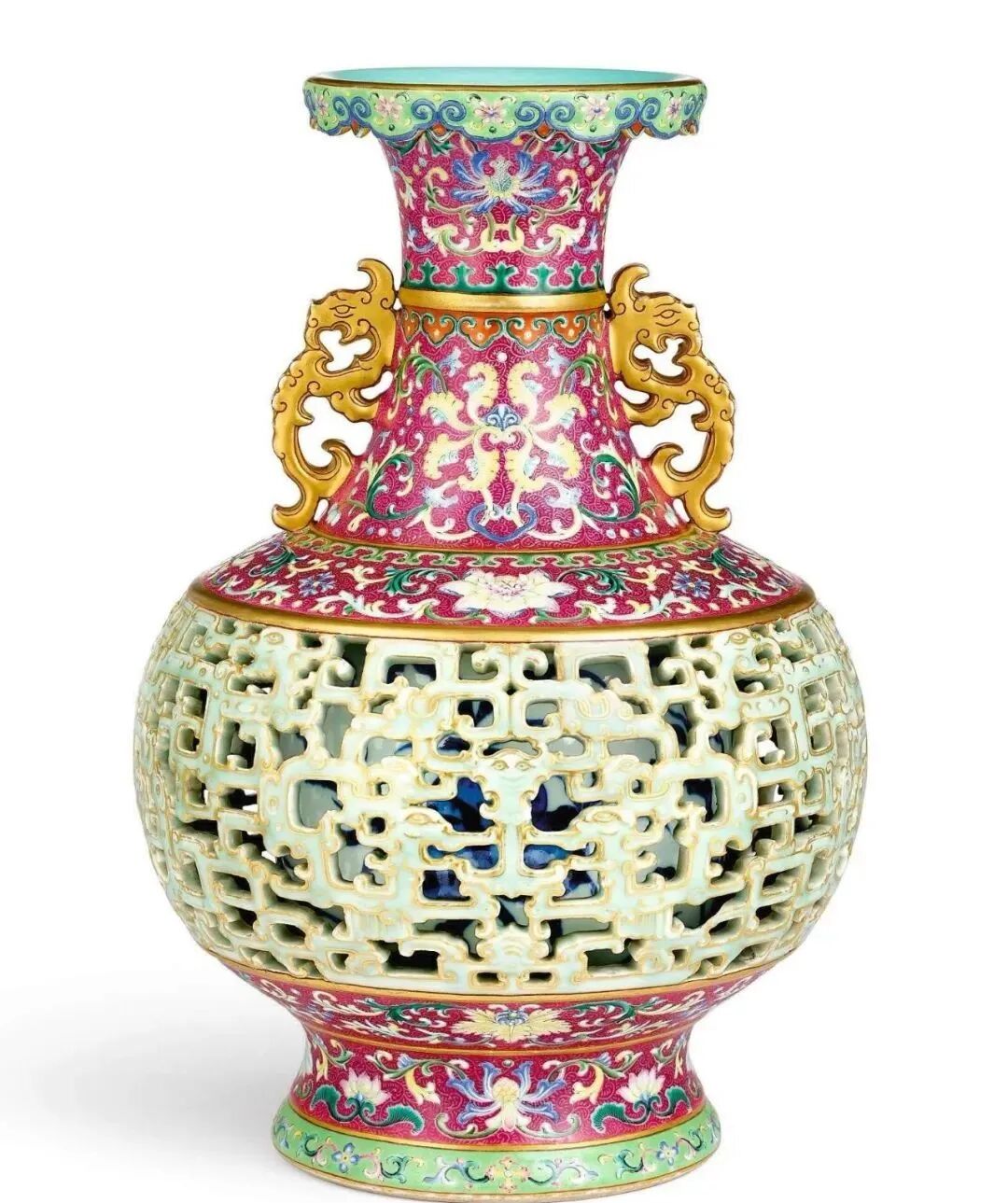 清乾隆 洋彩红地锦上添花冬青玲珑瓶(7000-9000万)