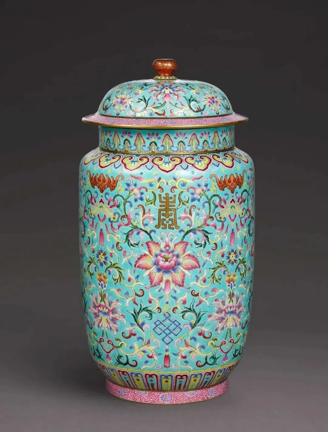 清嘉庆 粉彩松绿地番莲纹万福吉庆盖罐(150-250万)