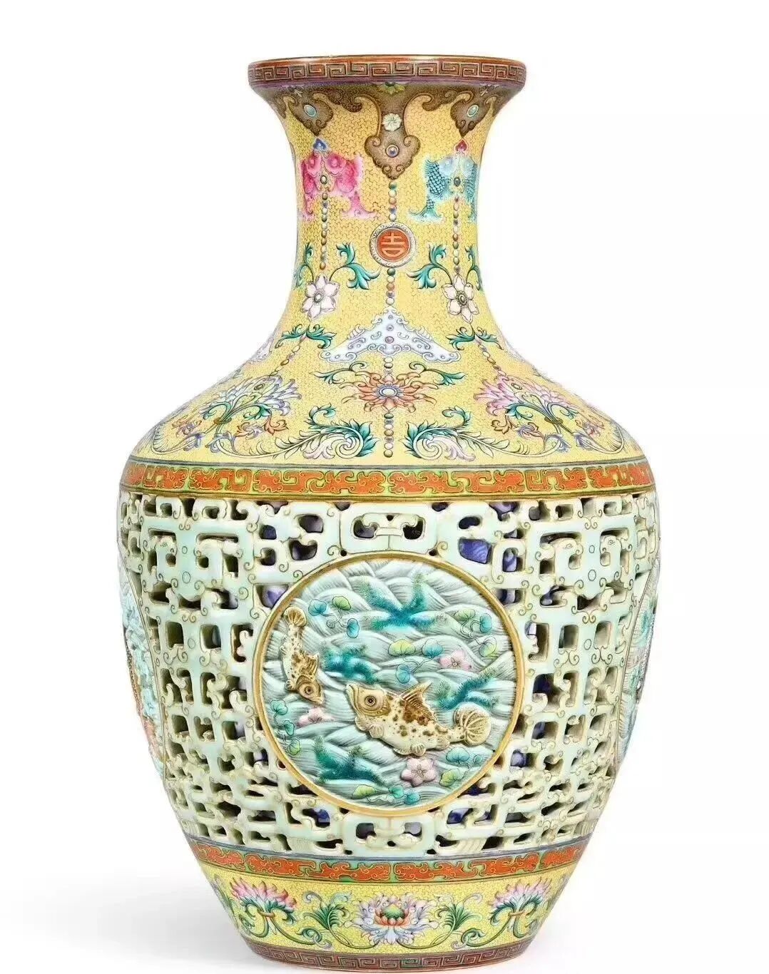 据 Regina Krahl(康蕊君)考据,此瓶似为孤品,或从没成双烧造。市场价格可参考去年香港苏富比1.5亿港元成交的另一件乾隆洋彩吉庆有余玲珑尊(下图)。这件7000-9000万的估价并不算高,能否再创新高,7月11日揭晓。
