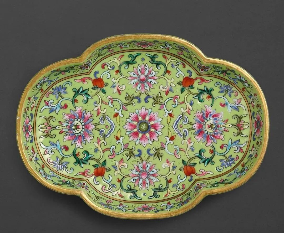 清道光 粉彩绿地缠枝番莲海棠式茶盘(25-30万)