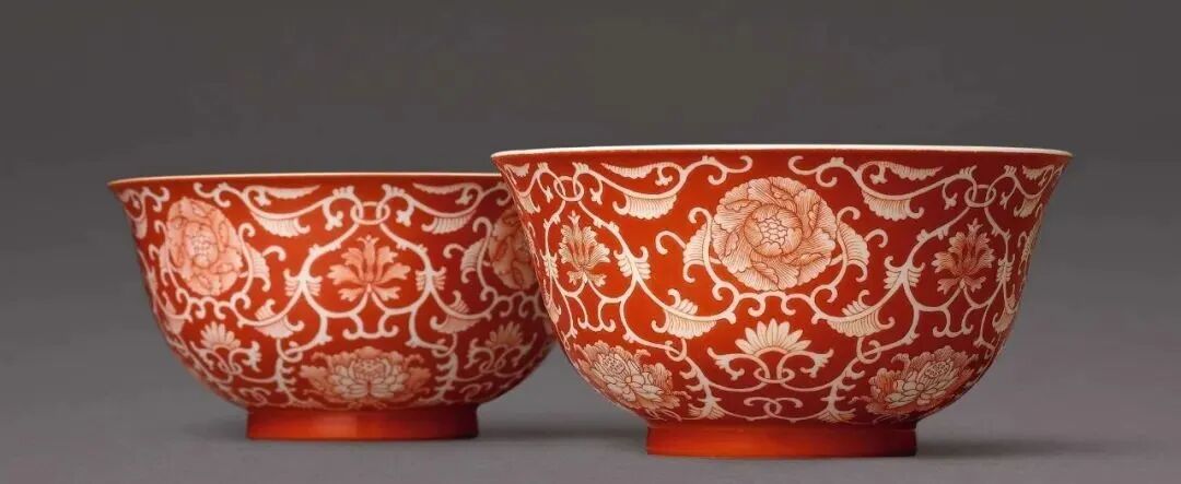 清乾隆 珊瑚红彩留白缠枝花卉图碗一对(120-180万)
