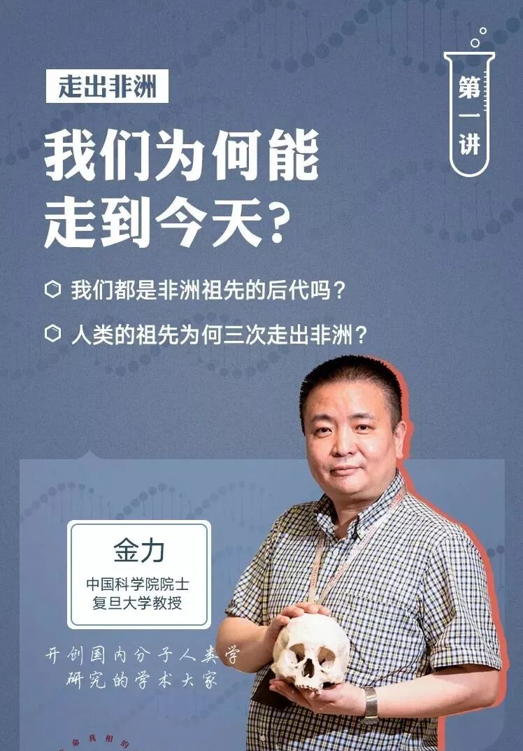 我们首先邀请到中国科学院院士、复旦大学金力教授,为你讲述人类的起源。金力曾是“人类迁徙遗传地理图谱计划”的东亚和东南亚地区总负责人,他带领团队收集样本并最终分析证明:中国人的祖先同样来自非洲。从他的讲解中,你将了解我们的祖先是如何走出非洲、走向亚洲。