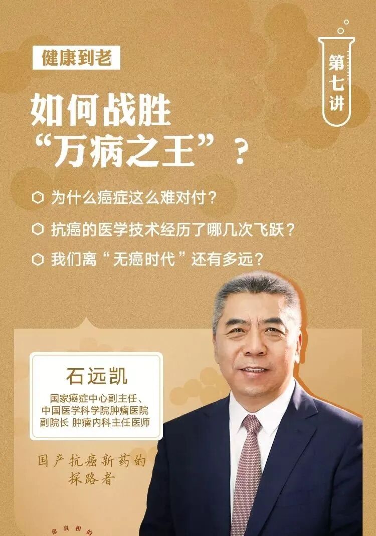 人人都追求长寿,但拥有更长的寿命,并不意味着更加健康。事实上,随着年龄的增长,很多慢性疾病的发生率也在同步增长,越来越多的老人躺在床上度过余生。如今,癌症、心血管疾病和老年痴呆症,也被认为是最致命的老年“三大杀手”。这一讲,我们将聚焦癌症。为什么癌症这么难对付?为了抗击癌症,人类的医学技术经历了怎样的飞跃?我们离“无癌时代”还有多远?第二版块第四讲,国家癌症中心副主任、中国医学科学院肿瘤医院副院长肿瘤内科主任医师石远凯教授将为你普及科学的癌症知识,用三十多年的肿瘤临床研究和实践教你正确防癌。