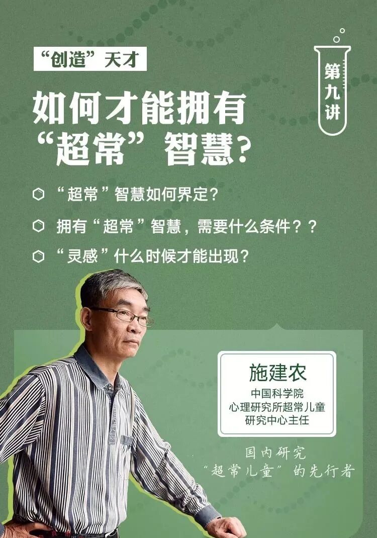 创造力是人类最核心的特征之一,每个人都有过“灵光一现”的时刻。最后一讲,我们邀请到中国科学院心理研究所超常儿童研究中心主任施建农,他将结合自己多年的研究成果,带你探秘人类智慧的潜能,以及有关创造力的诸多问题。“灵感”的来源是什么?“天才”是否可以通过后天培养而成?创造力和智力如何交汇运转?相信通过施建农的讲解,你对于自己乃至下一代的潜能开发,将有更加科学的认识。