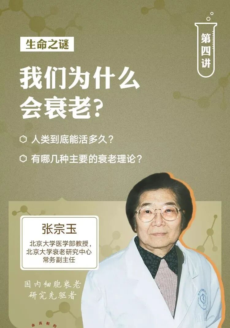 第二版块第一讲,我们邀请到北京大学医学部教授、北京大学衰老研究中心常务副主任张宗玉,为大家讲解人的长寿与衰老。张宗玉教授和童坦君院士这对学术伉俪,是我国老年医学基础研究的开拓者,他们数十年如一日的研究填补了我国细胞衰老研究领域的空白。相信通过张老师的讲解,你会对人的衰老有总体性的科学认识。