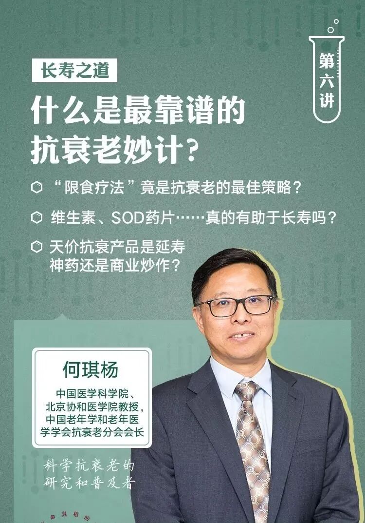 长寿基因的研究仍然在科学家的培养皿中,那到底有没有一种科学、靠谱的抗衰老方法?大众媒体健康版、养生公众号上充斥的长寿秘诀是否真的有效呢?第二版块第三讲,我们邀请到中国医学科学院、北京协和医学院教授,中国老年学和老年医学学会抗衰老分会会长何琪杨。他会为你讲述抗衰老物质的传说与真相,教你如何通过调整饮食延缓衰老,破除那些关于“长寿物质”的误区,理性地消费抗衰老产品。