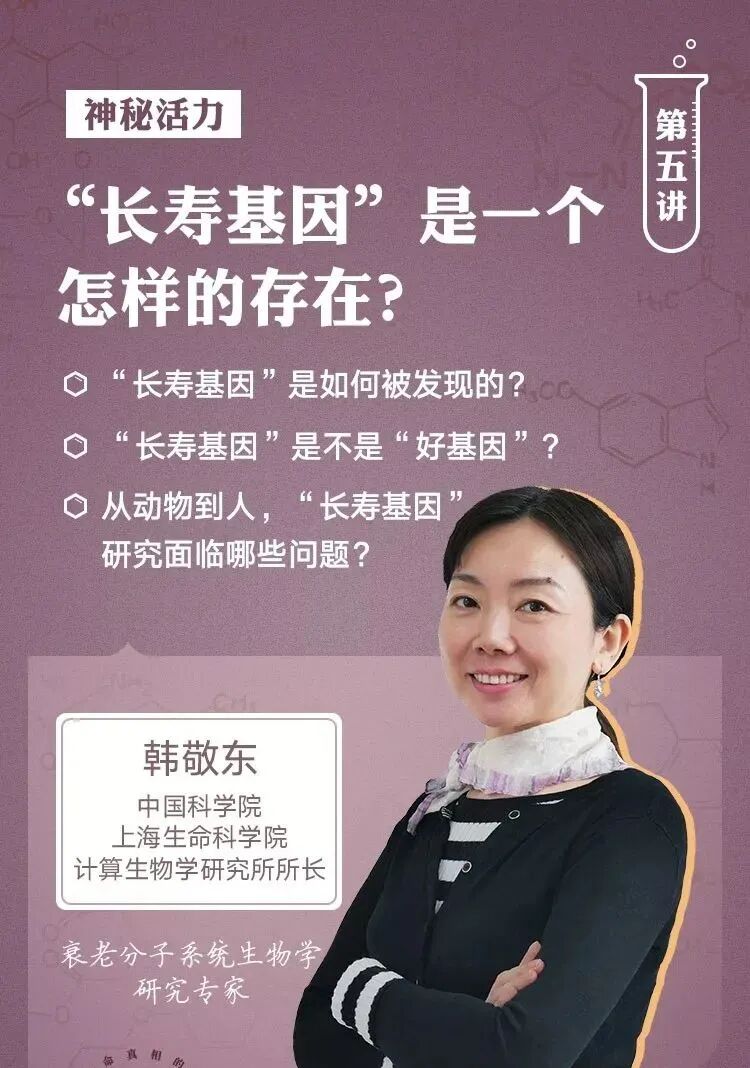 上世纪90年代,科学家在线虫身上发现了第一个“长寿基因”。一个看似很简单的基因突变,就能把线虫的绝对寿命提高60%,这让科学家们大吃一惊,“长寿基因”也因此成了衰老研究最热的课题。那么,“长寿基因”是如何被发现的?人类身上也有“长寿基因”吗?对于“长寿基因”的研究,我们应该怀有怎样的科学态度? 关于这些问题,在第二版块第二讲,中国科学院上海生命科学研究院计算生物学研究所所长韩敬东将为你一一讲解。
