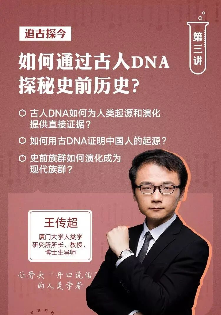 在了解中国人的起源问题之后,我们依然会心存疑问:时隔几十万年,科学家是怎样追溯我们的祖先,科学地调查那段没有记录的历史呢?这一讲,我们邀请到厦门大学人类学研究所所长王传超教授,来揭秘这背后的神秘技术。王传超是一位年轻的80后学者,但已是国内古DNA测序研究领域的佼佼者。他将为你科普:什么是古DNA,古DNA如何为中国人的起源提供佐证,怎样通过古人遗骸求证史前历史等问题。