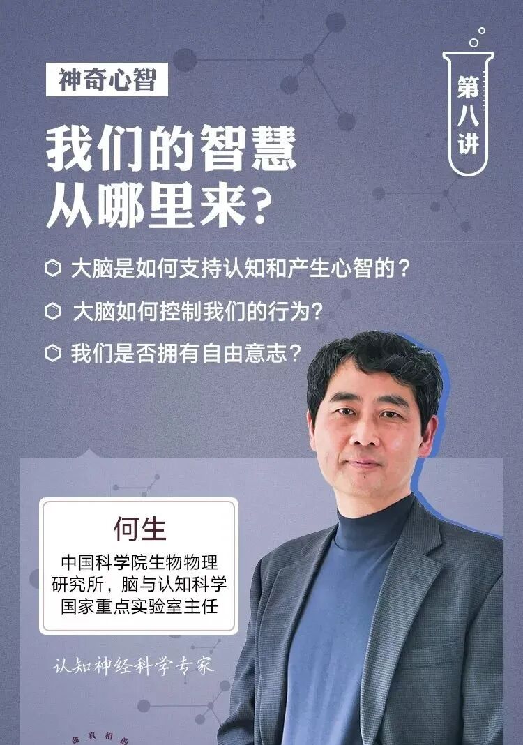 在这一版块,我们首先邀请到中国科学院生物物理研究所,脑与认知科学国家重点实验室主任何生,他将带你走近人类神奇的大脑。文艺复兴时期,伽利略用实验的方法来研究科学,这启发了生物学家采用实验的办法研究人类的心智问题。科技发展至今,对人类心智的研究都有哪些进展呢?何生老师在这一讲中,将从科学的角度为你介绍:人类心智的运作机制,以及人类智慧和创造力的起点。最后,他将探讨困扰人类已久的疑问:我们是否拥有自由意志?
