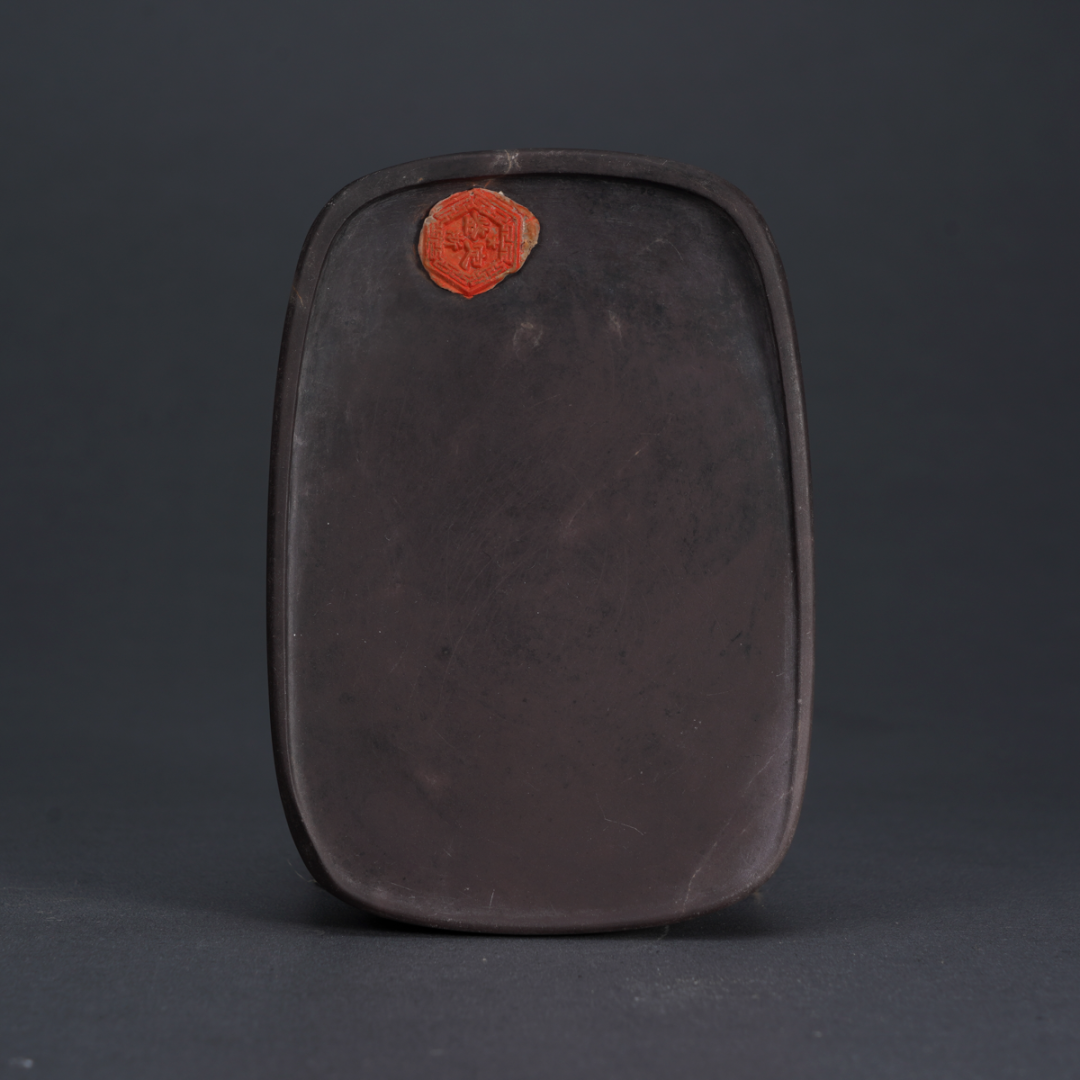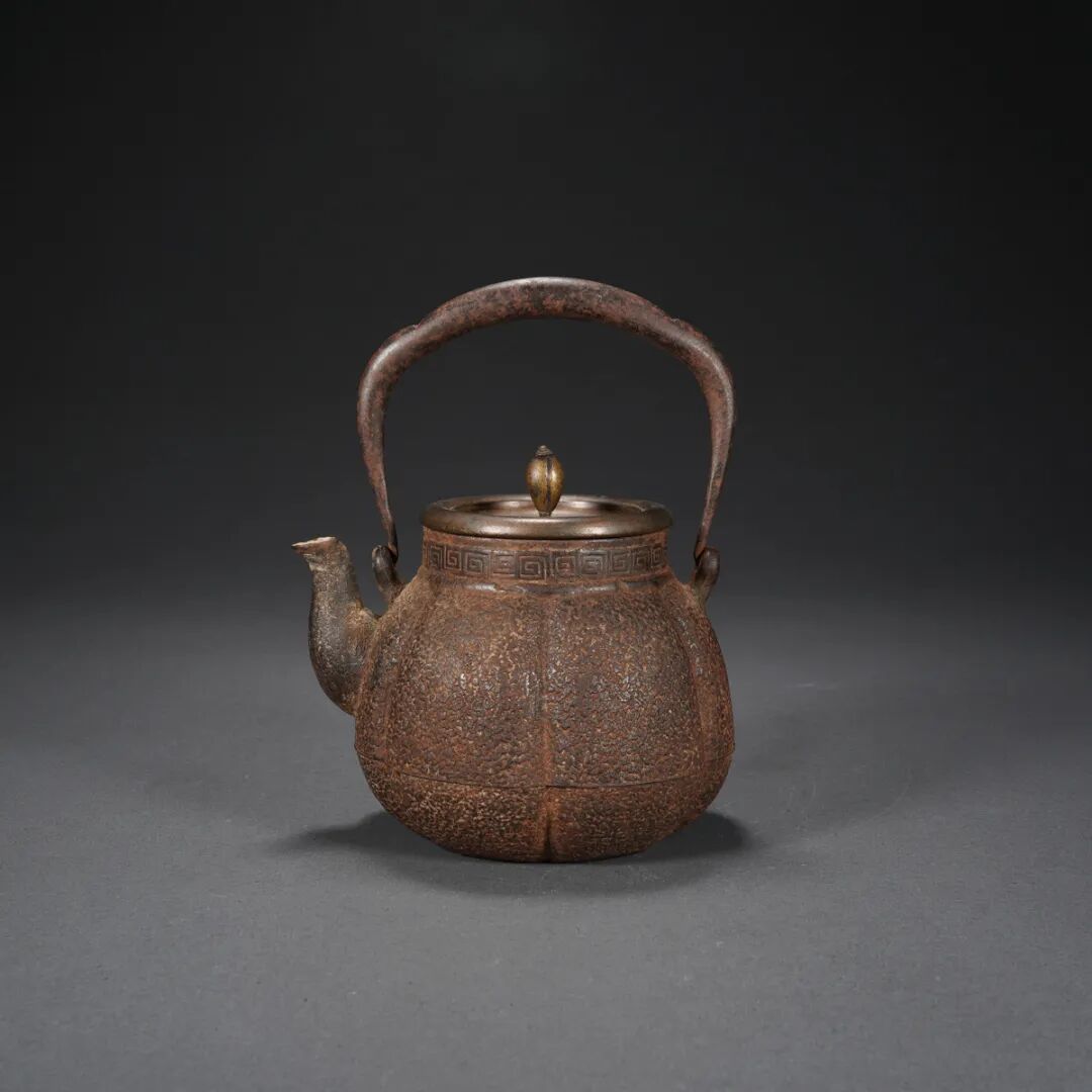 铁壶作阿古陀式,肌理均匀,器壁厚重,肩部至颈部过渡舒缓,其上饰一圈回字纹,束口轻松而不呆板,腰线至底略收,呈现很好的立体效果,稳重端庄。斑紫铜盖,三弯铁把,梁足稳固;花苞摘钮,流嘴饱满而立体,水径通畅。
