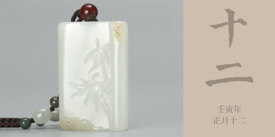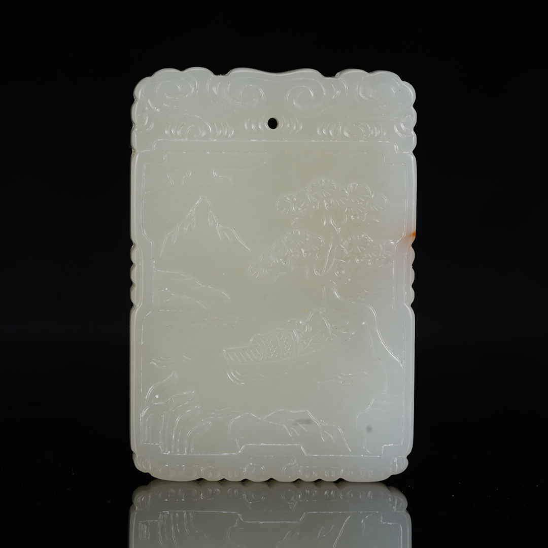 玉牌白玉制,局部受点状沁。牌正面以简练线条雕高士行舟图图,人物生动自然。背面浮雕诗词:”江清白鸟斜,荡桨罥苹花。听唱菱歌晚,回塘月照沙。“![]()