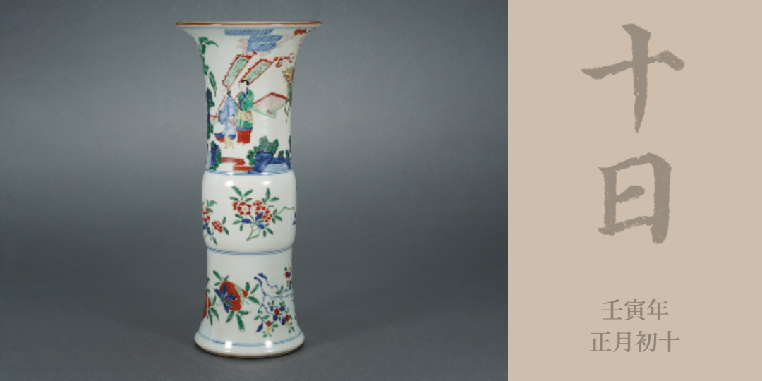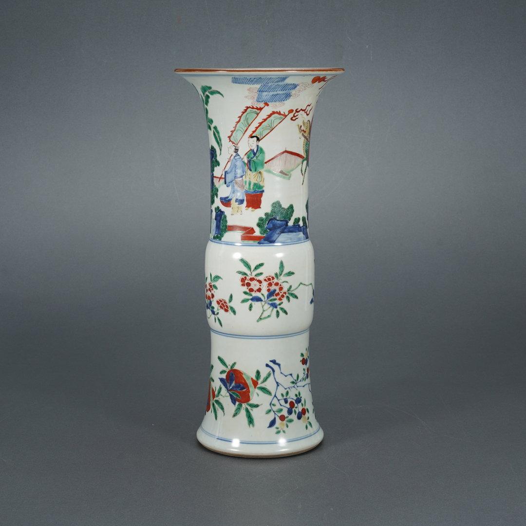 花觚翻口,鼓腹撇足。其型规整端庄,其釉莹润洁净,器口沿外壁绘加官进爵图,鼓腹处花卉纹,绿叶陪衬,五彩缤纷,跃然器表。