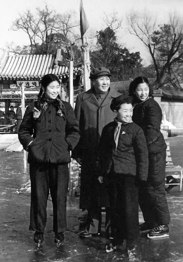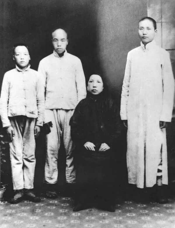 1919年,长沙,毛泽东同母亲文氏、两个弟弟毛泽民(左二)、毛泽覃(左一)。1937年,延安,毛泽东和贺子珍。贺子珍是仅有的五名参加长征的女性。1928年毛泽东与贺子珍结婚。