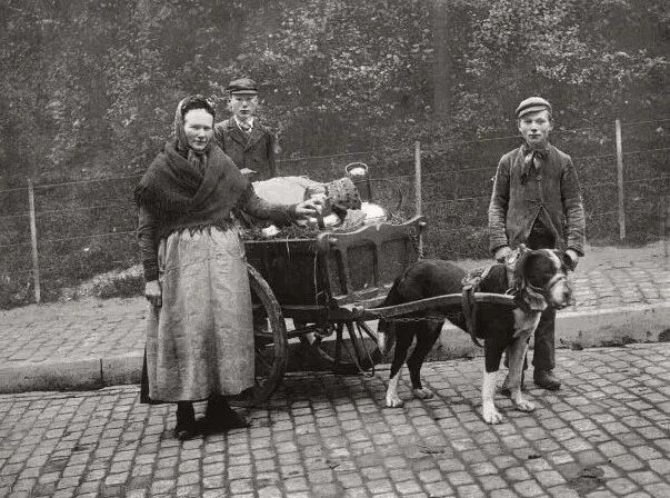 1890年代,比利时布鲁塞尔的卖奶人会使用狗来拉车。
