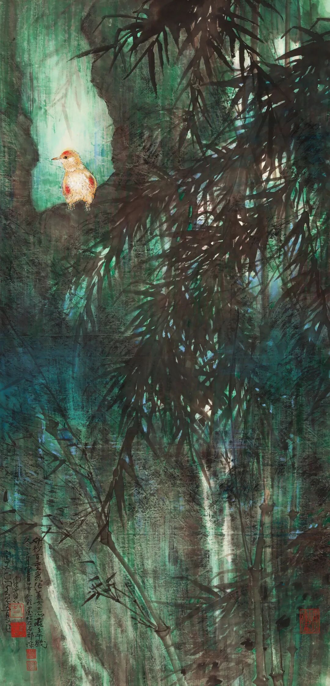 题识:花山珍禽。健碧此图起草于名都城,五年于春城竣工,时丙戌初夏。