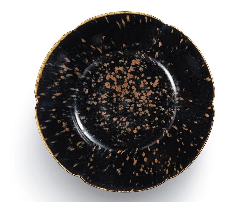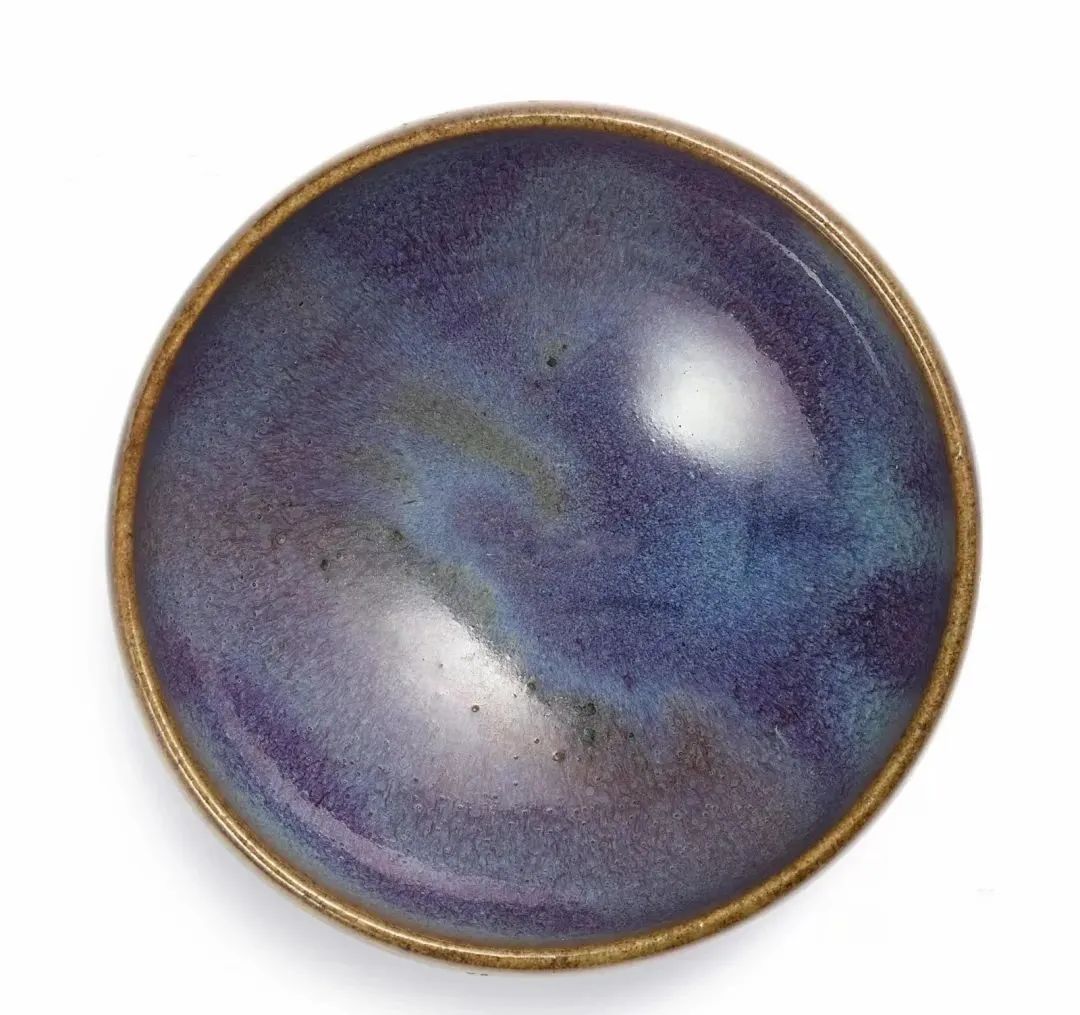此盘六瓣葵口造形,类同宋代漆盘,口沿削切圆润小角,葵瓣间隐现浅沟,纤雅利落(漆器例见图一:坂本五郎旧藏漆盘,2013年10月8日售于香港苏富比,编号141)。汝州张公巷窑址出土近似之深棱六瓣葵式瓷盘,此窑所造之器近类汝瓷,但几无传世之例第29名 北宋 钧窑紫斑盌