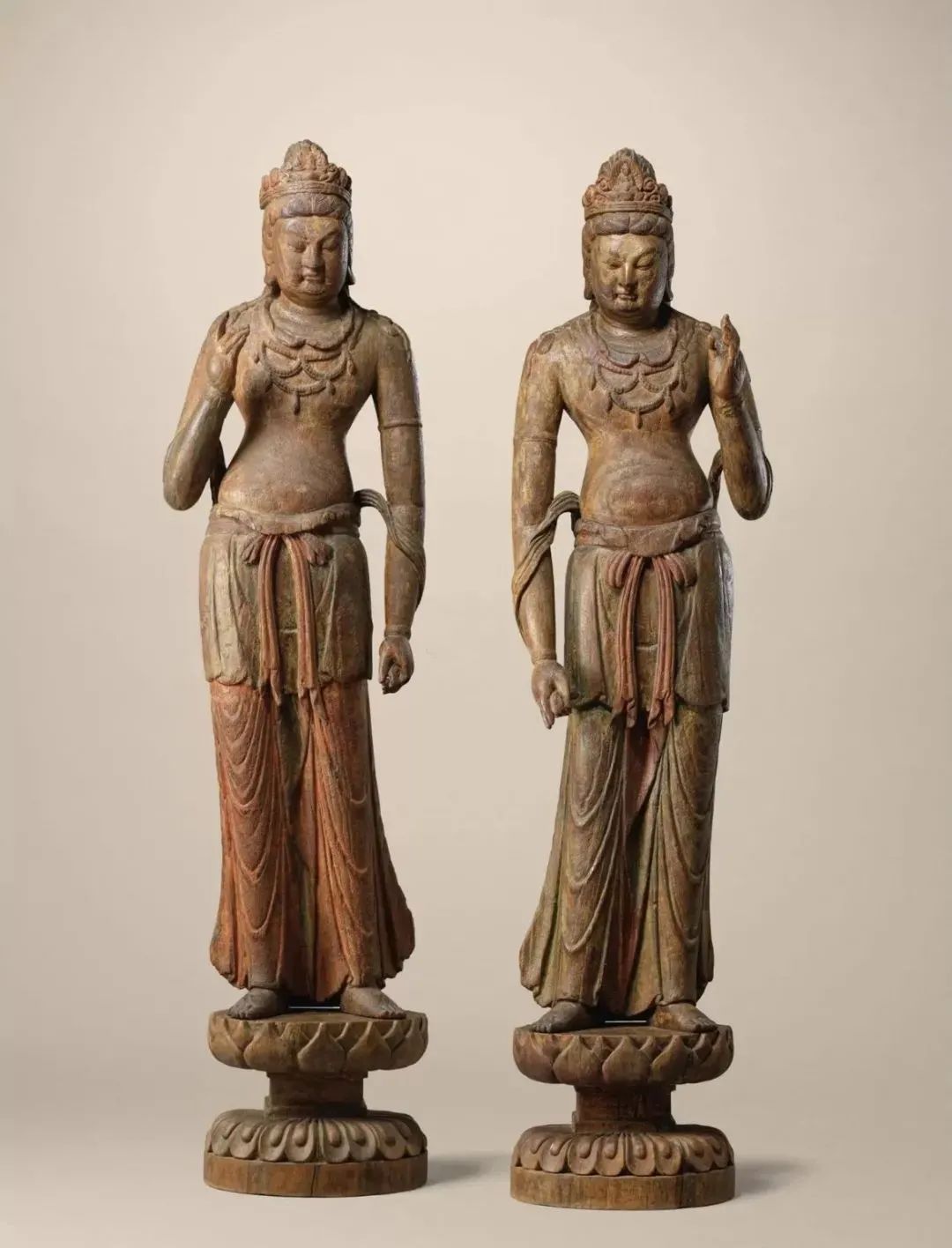 本拍品弥足珍贵,充份体现了宋代幽微素雅的审美意趣。八百多年来,此类极品龙泉青瓷在中日两地均被奉为圭臬,常被视为传家或镇寺之宝代代相传,而这一现象在日本尤为普遍。此瓶的釉料肥腴失透、温润如玉,荟萃了龙泉青釉最为人称许的特质。第13名 五代/北宋;10/11世纪 木雕菩萨立像 (一对)