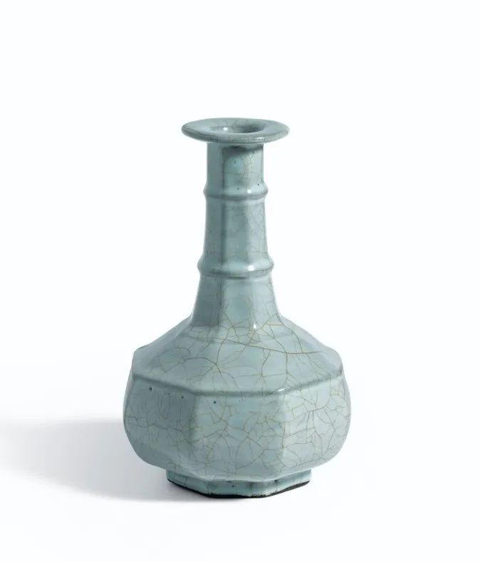 瓶八方,圆盘口,长颈往下渐宽,间饰弦纹成双。下接垂肩,棱角分明,硕腹丰盈,器形端庄,刚中见柔。底承八方圈足,胎呈黑褐铁色。通体罩施青釉,微偏灰,若水映晴空之色,澄澈莹润,隐透丹霞,不失温煦。片纹自然泛金,浓淡不一。釉质丰厚,抚如琼玉。口沿釉稍流敞,色呈绛紫,圈足釉略蓄聚,质若凝脂。配日式双重梧桐木盒。
