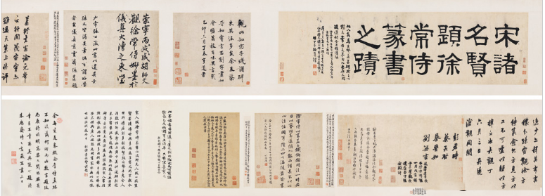 宋版书一直被视为古籍善本中的珍品,被历代藏书家所推崇。在藏书家们眼中,宋版书年代久远,校勘精良,字画如写,兼并文物与文献价值。从南宋末年至今,能够流传的宋版书已经非常有限,目前存世绝大多数宋版书收藏于中国大陆、台湾和日本各大藏书机构中。据不完全统计,中国大陆馆藏宋版书近3000种,台湾地区约有500种,日本约有600种,此外欧美地区约有30多种,合计约4000种。近年来,拍卖市场偶露真容的宋版书寥寥,而又零本居多,全卷者极为罕见。此本《钜宋广韵》五卷为全本。第8名 朱熹 张景修 等宋名贤题徐常侍篆书之迹 手卷
