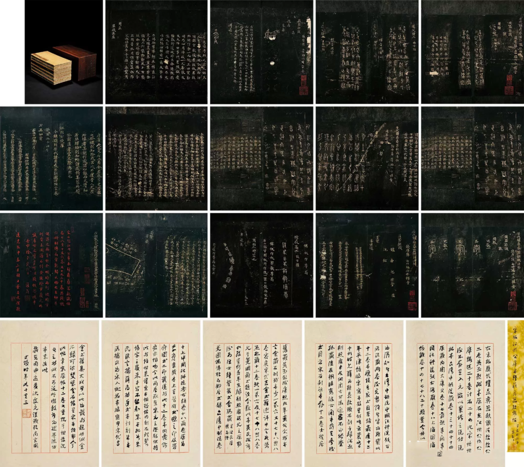 宋拓石刻孤本《历代钟鼎彝器款识法帖》存六册十二卷,两卷一册,存卷七至卷十六,又卷十九至二十,共十二卷。每卷卷首之卷数被墨隐去。六册置于楠木书匣中,上刻“宋拓江州公库本钟鼎彝器帖计六册 艺芸书舍藏”八分书。第五册第十五卷卷首缺失,用黑纸补;其余十一卷完好无缺。第15名 宋理宗 1205-1264, 1225-1264在位 楷书浅沙流水联句