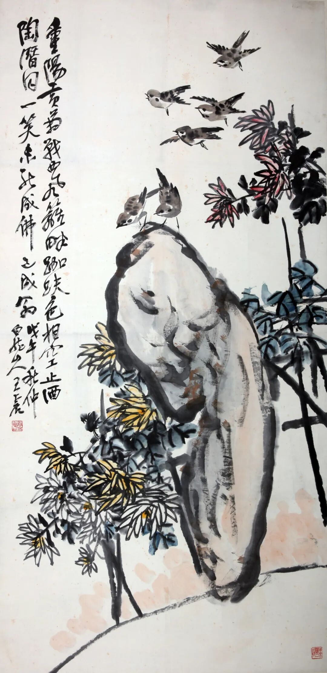 题识:重阳黄菊战西风,篱畔跏趺色相空。止酒陶潜同一笑,未能成佛已成翁。戊午秋仲白龙山人,王震。