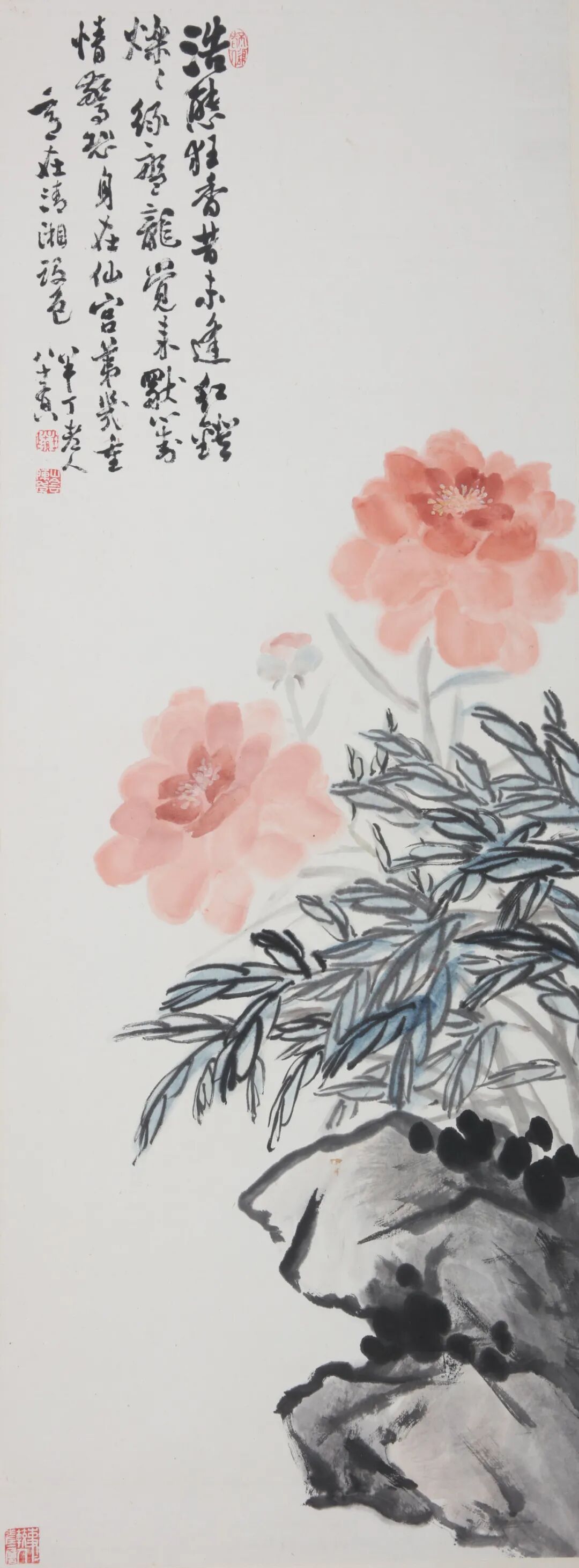 题识:浩态狂香昔未逢,红灯烁烁绿盘龙。觉来默对情惊恐,身在仙宫第几重?意在清湘设色,半丁老人八十有八。