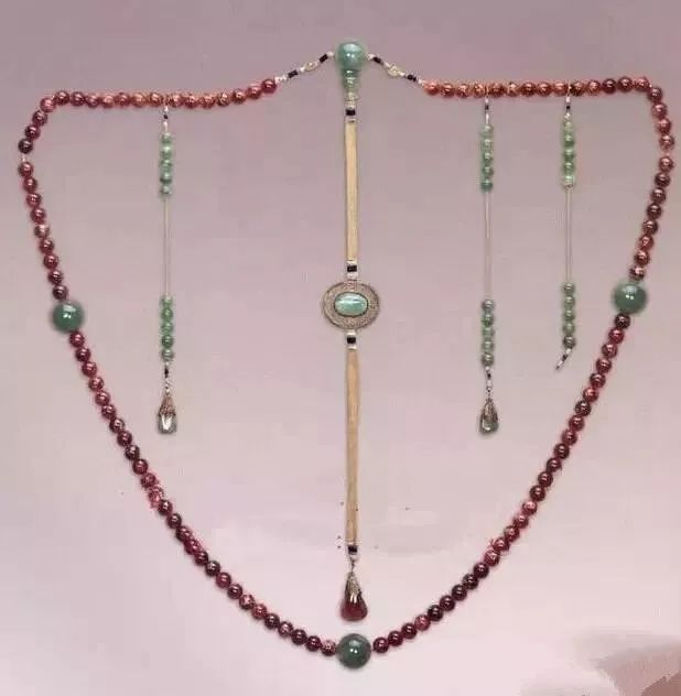 内外珠饰常见的材质包括:玛瑙、松石、珊瑚、天河石、煤精、砗磲、琥珀、琉璃、水晶、金银质、玉质、石质、骨质、牙质等。