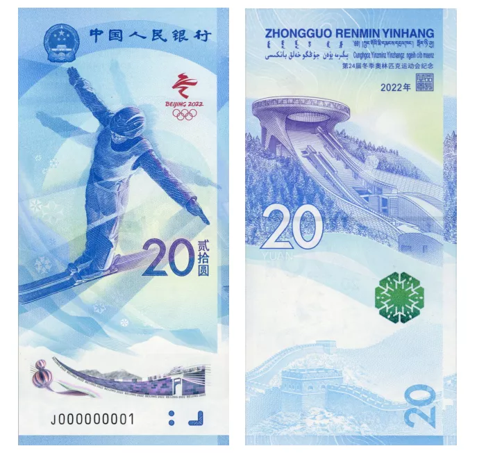 冬奥钞一套两张,每张票面长为145毫米,宽为70毫米,每张面额均为20元。冰上运动项目纪念钞为塑料钞,雪上运动项目纪念钞为纸钞。